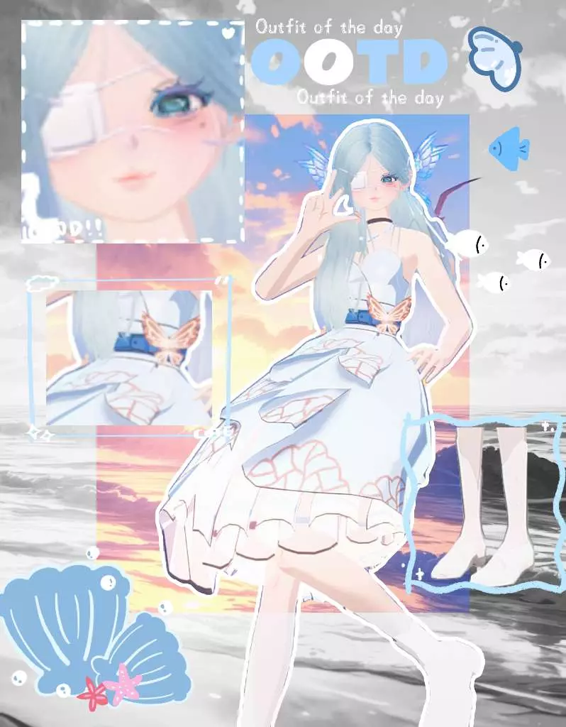蓝白相间的过膝裙+纯白水靴+人鱼妆:蓝紫相间的眼妆、淡粉唇釉,海风吹起时 耳后的鱼翅装饰会扇动