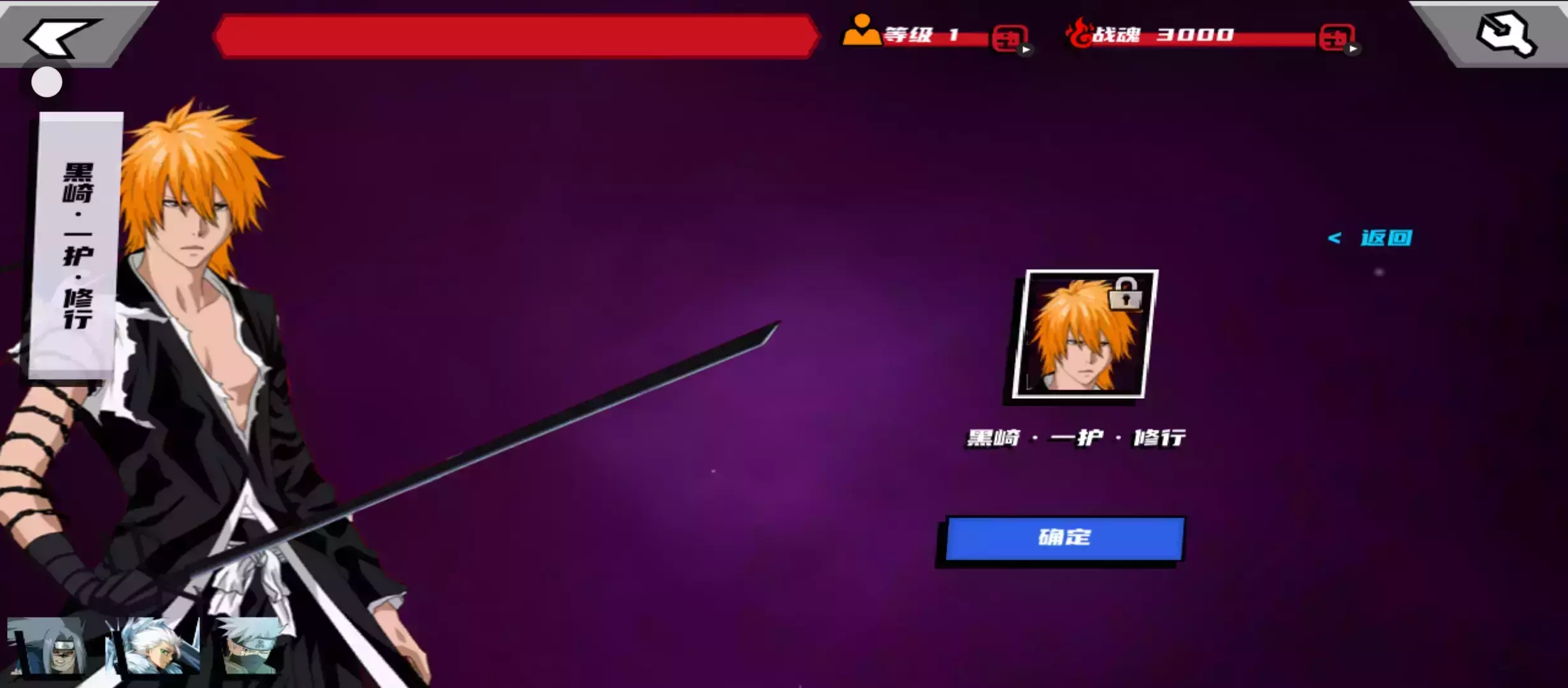 黑崎·一护·修行:一护在修行过程中不断突破自我,此次作为辅助人物登场。他能为释放出超强剑气,并将敌方击飞很远,在关键时刻助玩家一臂之力。