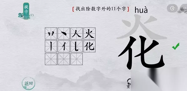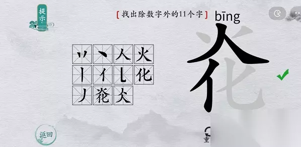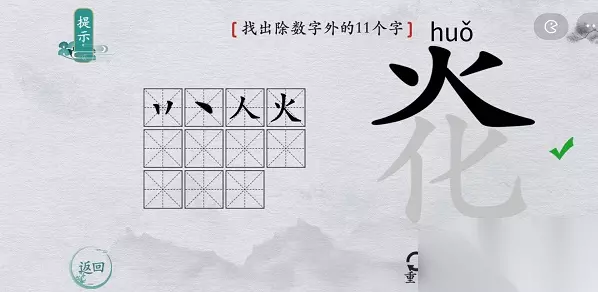离谱的汉字字找字攻略汇总 离谱的汉字炛找字攻略 1、关卡:炛——找出除数字外的11个字 【丷、丶、人、火、丨、亻、乚、化、丿、炛、仌】