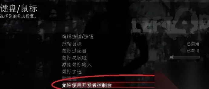 2、连接后,进入游戏并开启控制台 (在“选项”--“键盘/鼠标”--“允许使用开发者控制台”,将“已禁用”变成“已开启”)