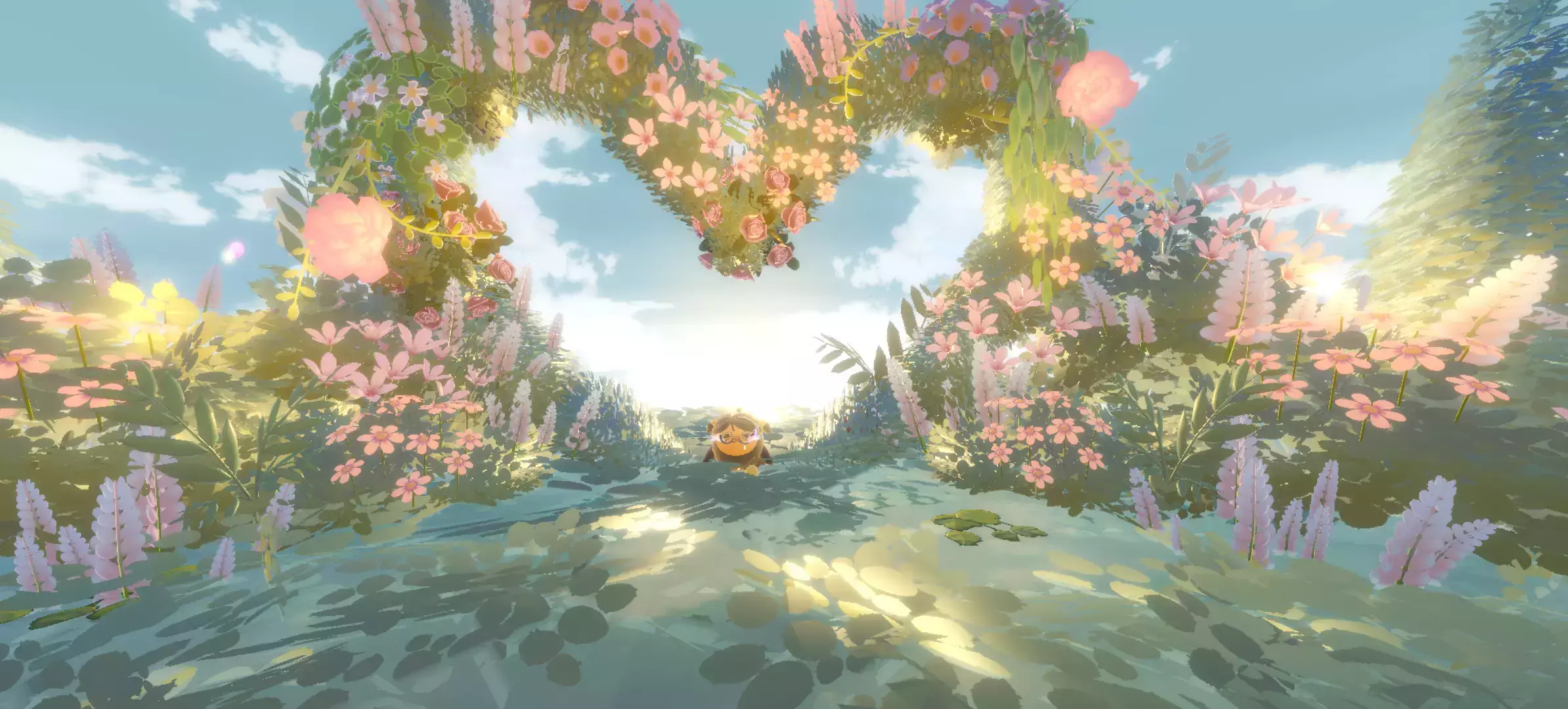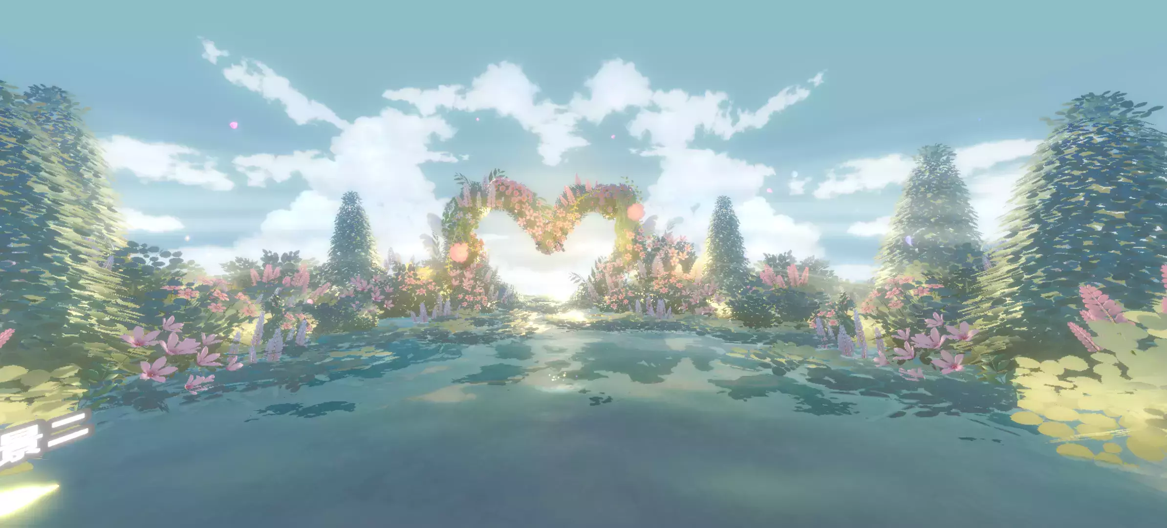 这里还有一个爱心呢,非常适合小情侣打卡拍照,云朵也是爱心型的呢,还有许多的花加一些美丽的滤镜,真的非常的浪漫!最后我也来拍照一张吧,因为没人陪我拍照,所以我就自己拍照啦~