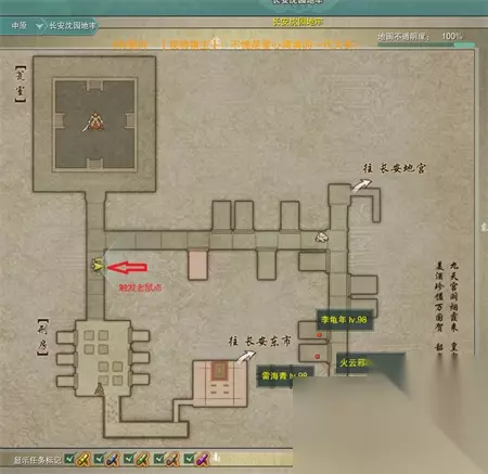 12、前往长安城-沈园地牢击杀火云邪神(需紫色残铁钥匙开门(必须要有【残铁钥匙】才能开门!开门了才能打怪!或者等别人开门的时候进去等火云邪神刷新),参照成就:西京名士,或直接世界收紫钥匙帮忙开门),获得任务物品:【火云邪神的头颅】。 沈园地牢进入办法: 1、神行长安战乱茶馆,有个水井,互动即可(比长安城更快到达地牢) 2、神行长安城,骑马去长安东市,到沈园互动书柜,进去后如下: