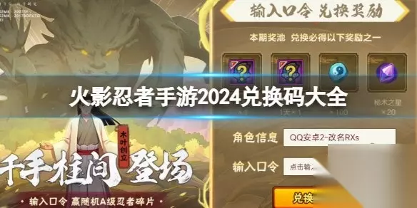 最新兑换码大全"> 火影忍者手游2024兑换码大全 一、兑换码大全 1、奇拉比、YZ999、hy666; 2、crj666、hy666xy、新春来木叶; 3、mxxfdvm、mxxfd777、uN3Hof30642; 4、AE6qGKn8FC、MXX888、MXX666; 5、MXX688、MN666666、MN888888; 6、MN233333、fd102、xfd666; 7、xfd777、xfd888、xfd999、xfd988; 8、DM555555、TT666666、xfdsq888; 9、yopkym、djbdy35、xfdxs2021; 10、happy2022、mxxfd888。 二、兑换码使用方法 查看游戏设置→密令→输入指定密令→完成兑换领取奖励。