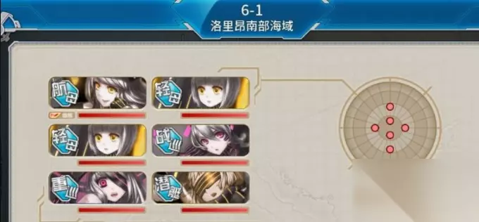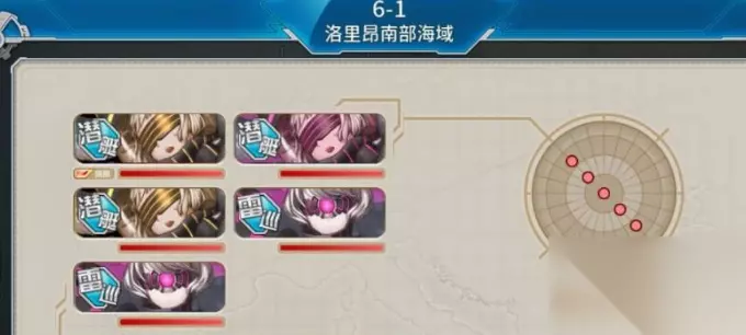 6-1关卡H点打法: 遇到航母,制空足选复纵阵型,制空差选轮型;遇潜艇就单横,如果敌方还有战列或者战巡就复纵碰运气;航母潜艇两者都有的,选复纵阵型,如下图所示;