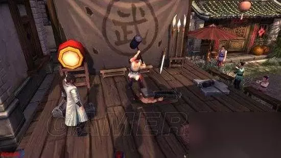 洛阳城-铁老三的大锤(支线) 1.擂台上可以花费10钱,观看胸口碎大石的表演,但是并没有成功。再次与其对话,请求帮助再打造一把精钢铁槌。