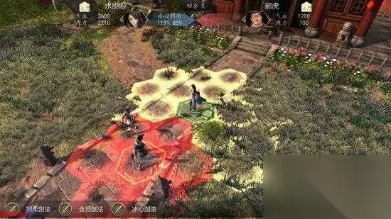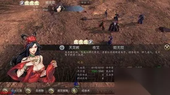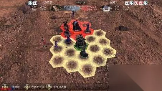 上方的信息栏中显示了「战斗回合数」以及双方「气血」、「内力」的基本信息。 双方头像中间部分当前选择情况下的对招信息蓝色表示己方:「独尊龙王决|招式名」、「1711|伤害威力」、「93%|命中率」、「8|当前招式已修炼至八重」; 红色表示敌方:「孽镜沉暮|反击采用的招式」、「1888|威力」、「18%|反击率」、「9|招式境界为第九重」。 双方名字外侧分别为两者的状态栏,鼠标移动上即可查看具体信息。增益状态的图标方向向上,减益效果图标向下。 界面下方表示角色可使用的技能,技能名称若为「绿色」则代表为「恢复型技能」。若在技能图标右下角出现「数字」,则表示需再过对应回合数才能再次使用,右侧的「物品」点击后可以使用物品,但失去本回合攻击机会,「休息」则表示放弃人物操作。 主界面中黄色六宫格代表「技能范围」,红色表示技能「伤害范围」。 2.战斗中右键点选人物后可以查看角色的详细信息,在人物属性值上出现颜色非白色的属性时,鼠标移动至数值上可以查看到相关增益(绿色)或减益(红色)对其造成的影响。