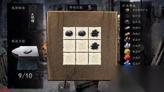 3.出门后在熔炉处打造铁锤。「打造」的过程其实就是玩一个2048的小游戏,获得指定数量的材料即可。如果没有顺利完成目标,可以回去找铁老大再拿精钢。顺利打造后,和其对话获得1点「阅历」,出门将铁锤交予铁老三,可以获得物品与经验奖励以及1点「阅历」。