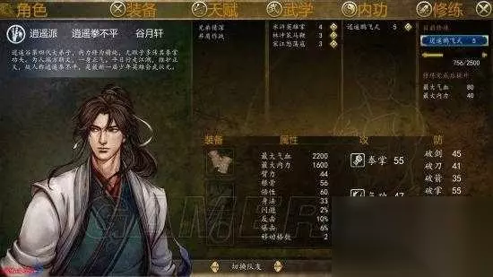 2.在角色信息显示出人物的详细属性,「天赋|被动」、「武学|招式」、「内功|属性相关」,在「修炼」位置,选择要提升境界的「武学」或是「内功」可以指定性的获取经验,快速提升。