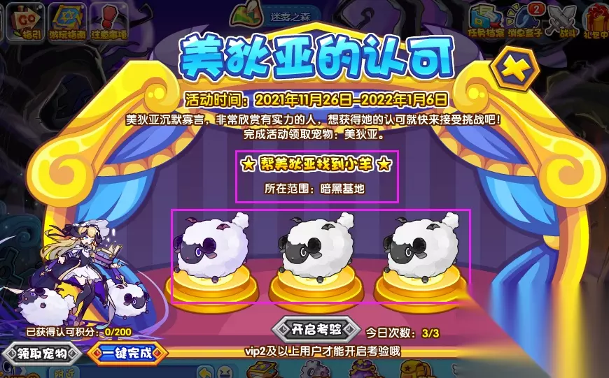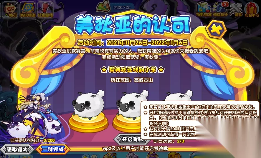 进入迷雾之森便可以看到美狄亚在哪里等待着大家啦! 让我们一起打开活动界面,先来读一读“活动说明”: 1、根据界面上的提示信息,到场景范围内帮助美狄亚找到跑出去的3只小羊后即可获得考验次数,开启考验。