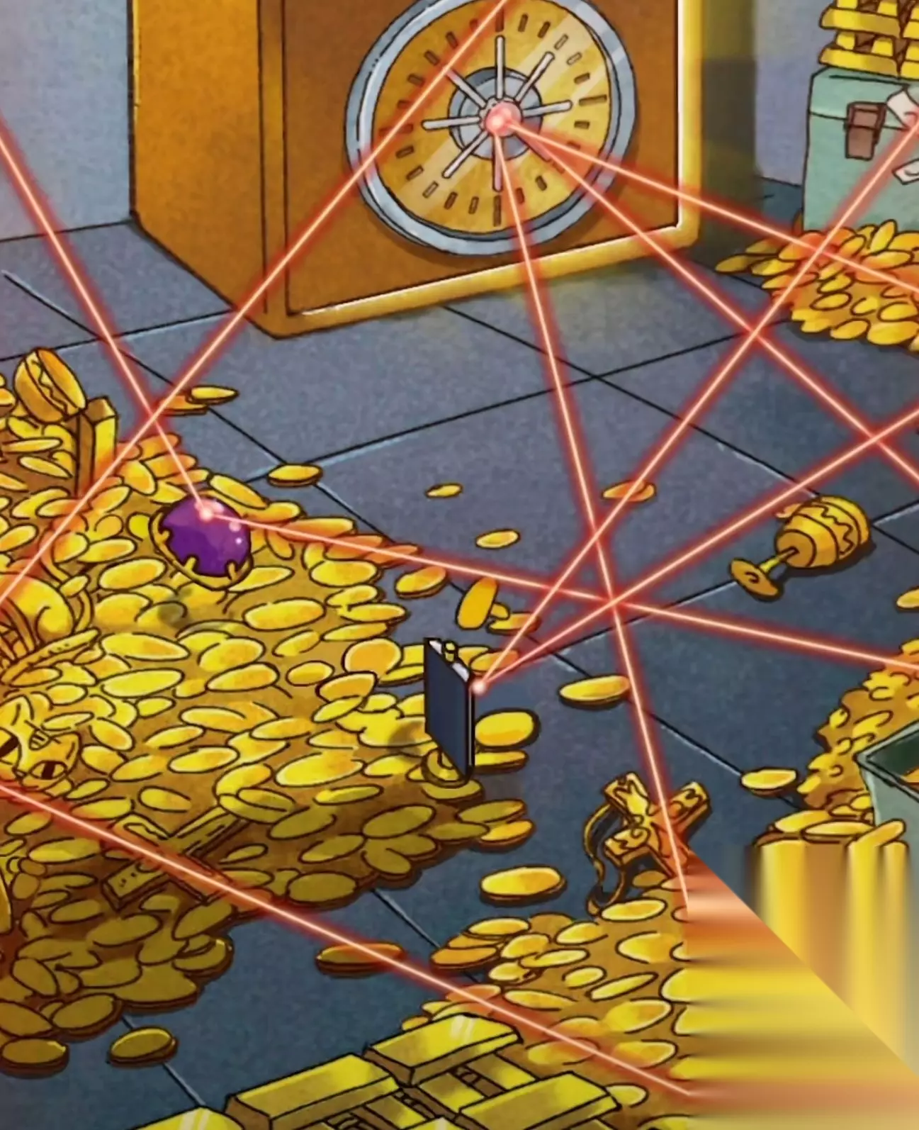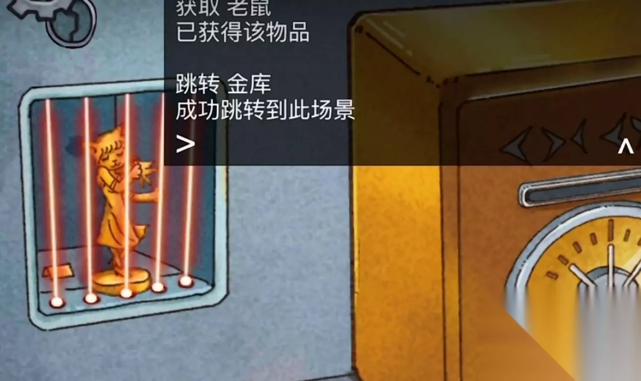 接下来跳转到金库,可以看到金库里面有一个红宝石,我们直接点击获取就可以,接下来点击一下保险箱触发一下警报,手电筒的位置就是将激光反射到其他位置,接下来我们将保险箱上镶嵌红宝石,就可以激活保险箱啦。保险箱是动态的,需要我们真正的旋转手机才可以打开保险箱,也就是说,我们需要打开声音,如果保险箱扭动正确的话,可以出现咖嚓一下。
