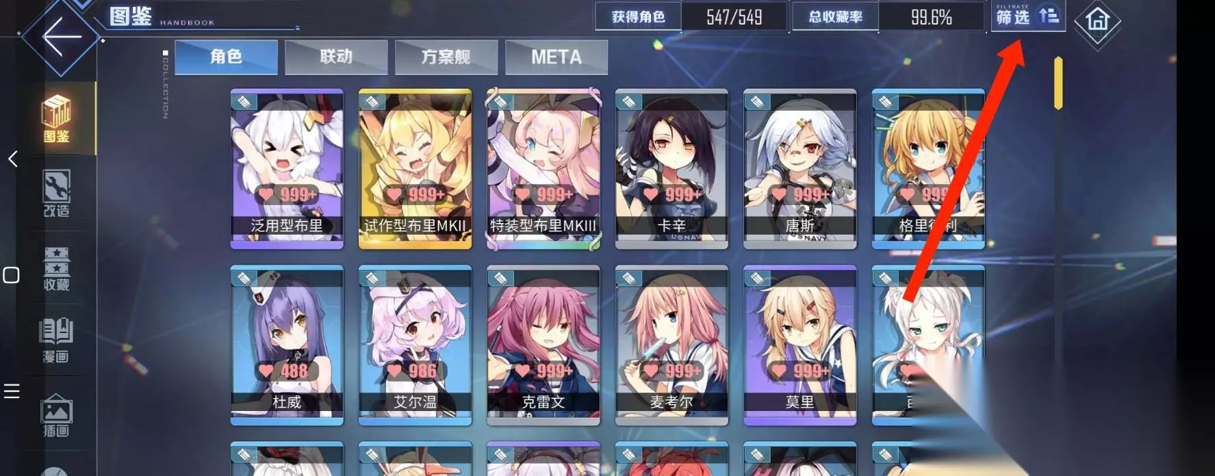 获取方法 首先,咱们得进游戏,看到主界面右上角的收藏图标,点一下。 进了收藏页面,左边的图鉴按钮得点开。 然后,右上角的筛选图标不能放过,点进去。 筛选词里,选“皇家主力”和“后排”。 确定筛选后,皇家主力角色就都出来了,随便解锁10个就行。