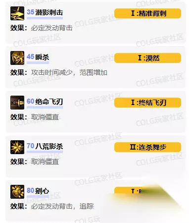 技能进化加点 35级【潜影刺击】加点:精准背刺 必定移动到后方,固定以背击命中 45级【瞬杀/瞬袭】加点:漠然 删除攻击成功命中后僵直,范围增加 60级【绝命飞刃/绝境飞刃】加点:终结飞刃 取消僵直,追踪最强敌人,范围增加 70级【八荒影杀】加点:连杀舞步 可以施放【瞬袭】和【死亡连舞】,取消僵直 80级【剜心/摧心】加点:暗影摧心 追踪敌人,必定以背击命中 技能强化 1、瞬杀/瞬袭:技能伤害 2、剜心/摧心:技能冷却/伤害 3、绝命飞刃/绝境飞刃:技能冷却/伤害