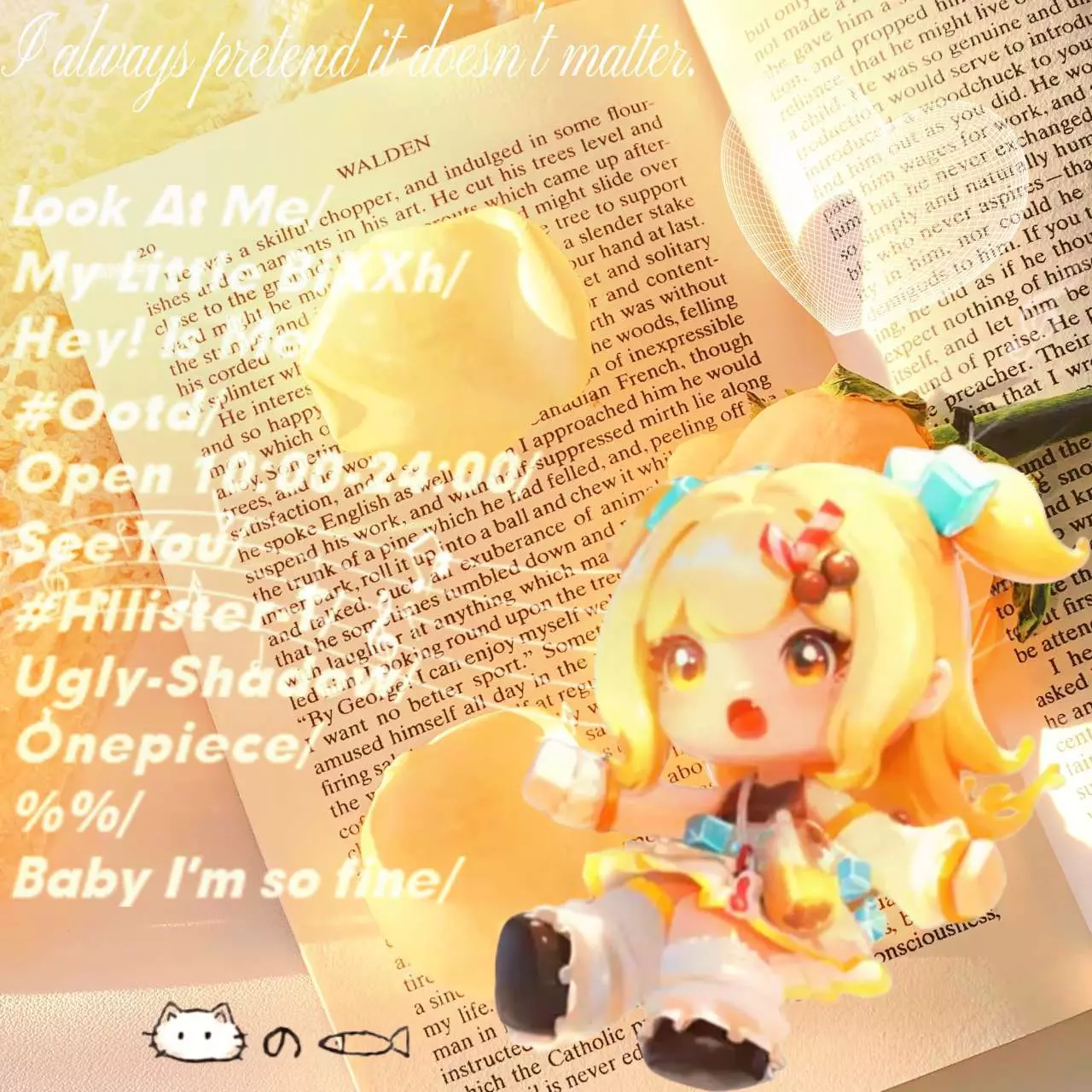在书页间像个偷喝了橘子汽水的小精灵🧚♀️ 发丝晃着暖黄光晕,张开的手像在喊“快看我呀~”,那些英文标签是她的俏皮咒语,把“Baby I'm so fine”的甜,融进每一缕照在书页上的光里,连小猫咪和小鱼干,都跟着悄悄心动~