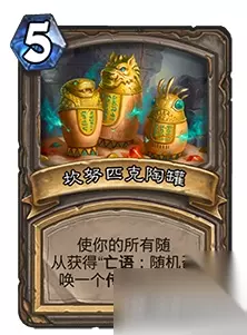 1、坎努匹克陶罐 让己方所有随从获得亡语“随机召唤一个传说随从” 解析:能够让玩家铺场后的随从拥有质变能力,即使全为低费随从也是一波较为强力的铺场法术,但必须注意的是这些随从的亡语容易被对手利用高费法术解掉或者反过来利用。