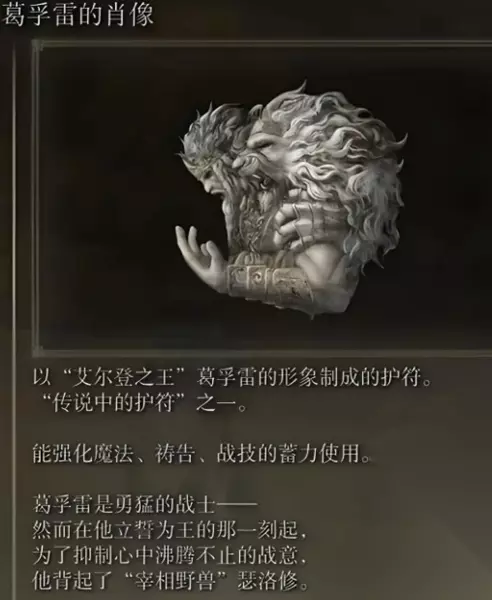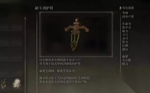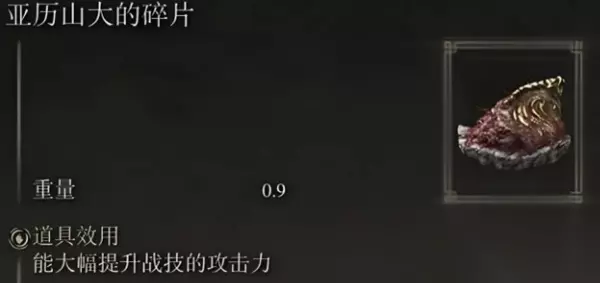 效果:满血增加10%攻击力 获取:黄金树山丘卢卡斯废墟,山上有另一座废墟,地下室打“亚人女王”boss后获得。