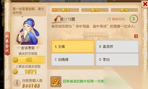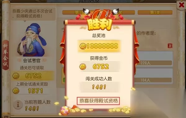 3、乡试的时间是当天12:00-14:30,和会试一样,所以如果你是第一次玩需要先通过乡试才能参加会试。 4、在这个时间段内可以参加2次会试/乡试,因此先去乡试再进行会试也是可以的。 5、通过会试后,殿试的时间是当天16:30,只有在乡试中得到前20名的玩家才能进入殿试。