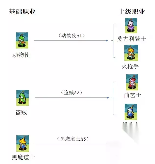 1、动物使 莫古族初级职业,可辅助、可回复、可攻击,适合打游击战。【百羊】可以让敌人睡眠,【纯羊毛】可以提升提升自身的物理防御力和魔法防御力,【调和之后烹调】可以使目标的HP全回复,【陆行鸟暴走】可以攻击一条直线上的敌人,最有趣的是【朋友的介绍】,随机叫出一只召唤兽(和维艾拉族的召唤魔法的召唤兽相同),随机性太强,不一定是攻击类的召唤兽,也有可能叫出回复的召唤兽。算是前期比较有趣的职业。 2、莫古力骑士 莫古族最强的战士,有3倍攻击技能【阿鲁迪玛蓄力】,其它技能比较不实用。推荐主职业火枪手,副职业技能莫古力骑士【蓄力】,装备最强火枪,射程9格,几乎可以攻击到整个地图的敌人,但是,因为属性成长问题,这样子搭配的攻击伤害没有人类的【猎人】和维艾拉族的【狙击手】高。 3、曲艺士 莫古族里成长最好的职业,偏辅助型角色,技能方面主要是造成伤害并附加各类异常状态,静止、暴走、混乱、无法移动、无法行动等,最实用的技能【微笑】,相当于时魔道士的【迅捷】,可以使我方二次行动。建议前中期作为职业成长,用微笑进行辅助,后期再转为其他上级职业。 四、恩莫族 推荐转职:幻术士、炼金术士、贤者