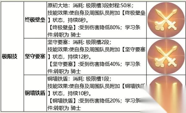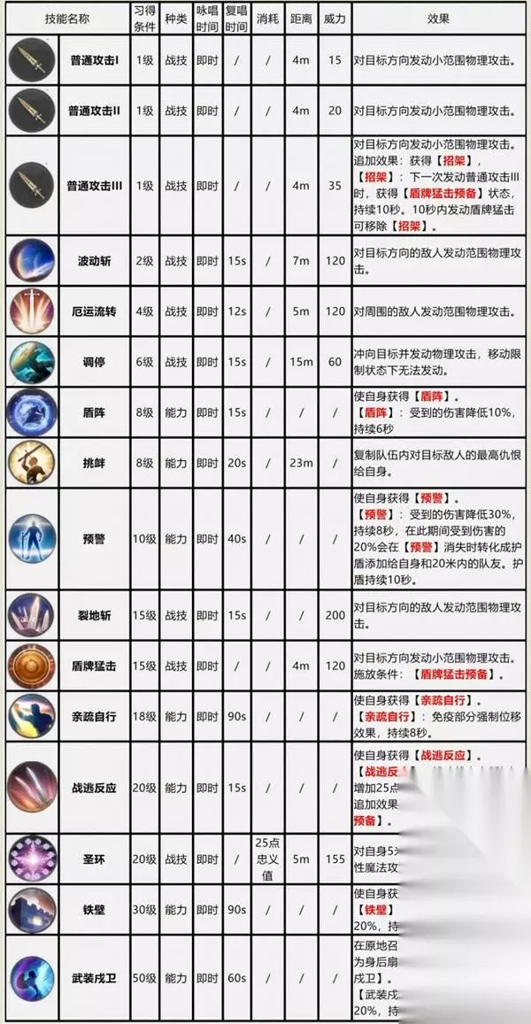 学会忠义后,画面上会出现专属的忠义量谱。普攻可获得忠义值,消耗忠义值可施放圣环。习得忠义精通后,波动斩和裂地斩命中也会获得忠义值,预警期间受击也会获得忠义值,所以这版本建议骑士作为MT。 输出手法总结 普通攻击端 普通攻击I+II+III+I+II+III+盾牌猛击为一循环, 需要注意25级后开启盾阵后受击或者主动使用战逃反应都会获得一次【盾牌猛击预备】。 那么会有两种情况: 1、 在没有【招架】的时候获得【盾牌猛击预备】 无【招架】但可能已经打了普通攻击I+II,此时如果因【盾阵】获得【盾牌猛击预备】,如果打普通攻击III获得【招架】再打盾牌猛击,会浪费一层【招架】。应该先打盾牌猛击,然后再打普通攻击III获得【招架】。 2、 已有【招架】且马上要触发【盾牌猛击预备】 有【招架】且因【盾阵】获得【盾牌猛击预备】,如果此时打普通攻击III,仅会刷 新【招架】的时间,所以应该先打掉盾牌猛击,然后打普通攻击III重新获取【招架】。 这两种情况都需要在普通攻击III命中前将盾牌猛击打出去以免亏BUFF。 能力技端 核心被动战逃反应精通会让后续3次圣环增加伤害,所以我们需要考虑开战逃反应后的15秒内让忠义值至少满足75点。 那么增加忠义值的方式有: ①每次普攻增加5点 ②战逃反应开启后5秒内获得25点 ③预警期间每次受击获取5点,最多20点 ④波动斩、裂地斩每命中1个敌人获得5点,2个技能一起最多获得40点。 考虑到副本机制和boss伤害轴,所以不考虑预警。此外波动斩、裂地斩的冷却是15秒,而战逃反应冷却25秒,实战中难以对齐CD。 所以只考虑①+② 波动斩、裂地斩CD转好就用。 我们需要在战逃反应CD快转好之前至少保留25点忠义值,然后开启战逃反应获得25点忠义值,中间用普通攻击填充剩下25点。开启战逃反应后就可以直接用圣环。 此外圣环要避免溢出,所以建议维持在25-75点中间,多的可以打掉泄资源 调停由于是有伤害且能积蓄2层,实战中我们需要保持他仅剩1层,2层快转好就立马打掉一层。 盾阵、铁壁、预警、武装戍卫为减伤技能,根据副本实战情况按需开启即可。 低级时的输出手法 1-19级:此时还没有忠义值系统,输出技能仅有波动斩、裂地斩和调停,在保持普通攻击连段下,将波动斩、裂地斩和调停适时打出避免技能CD空转即可。 20-39级:此时没学会【战逃反应精通】,那么就无需太纠结圣环是否一定要打入战逃反应的持续时间内,此阶段所有能力技CD转好可以直接打出。 40级以后:其实40级的骑士基本是完全体了,只不过没有45级被动之前忠义值获取较慢。那么这阶段我们需要留至少50点忠义值给战逃反应强化圣环用。也就是量谱槽尽量维持在50点忠义值左右。 装备获取 有主线的前提下,主线会给装备。练副职业的情况下,前期装备可通过职业任务获取或者商会NPC购买。 50级的时候可以先做完职业任务拿到职业套装过渡。 然后刷诗学神典石兑换110品级的杰作装备。