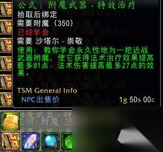 使其获得法术治疗效果提高最多81点,法师伤害提高最多27点的效果,沙塔尔崇拜声望购买 附魔武器—特效法术能量