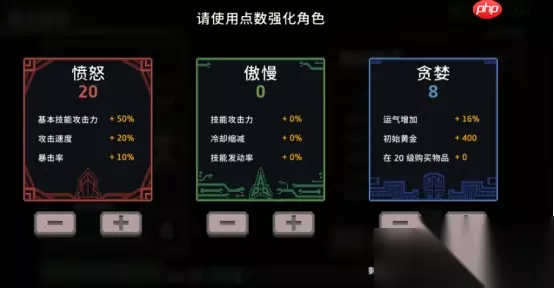 属性加点:主点愤怒,辅修贪婪 主加点 — 愤怒:这是机枪流的核心驱动力!选择“愤怒”路线可直接获得攻击力+50%、攻速+20%、暴击率+10%的强力加成。这三项属性高度契合机枪流对高频率、高爆发输出的需求,显著提升战场统治力。 副加点 — 贪婪:推荐作为次要加点方向,提供16%的运气加成和400金币的初始资金。更高的运气意味着更好的装备掉落与圣器获取概率,而起始金币则有助于早期快速成型,抢占发育先机。