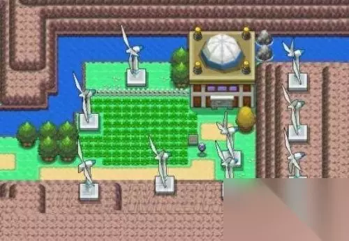 神奥地区-风力发电战 这也是神奥地图设计的巧秒之处,刚从花香飘摇的苑之镇走出,便走进了风力发电站……这作的发电战给力之处在于其地形所在之妙。位于两山之间的一个山谷,依山傍水而建,发电站旁的草丛中还有淘气的浮尾叉鼬时常冒出。最美的发电战