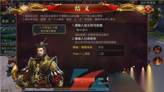 4、完成任务后,由队长代为点击桃园结义,创建结义称号后,点击确认(后续可自行更改昵称); 5、结义成功后,每位结义的玩家都可以获得结义称号,另外还需要花费2个绑银才可以完成结义;