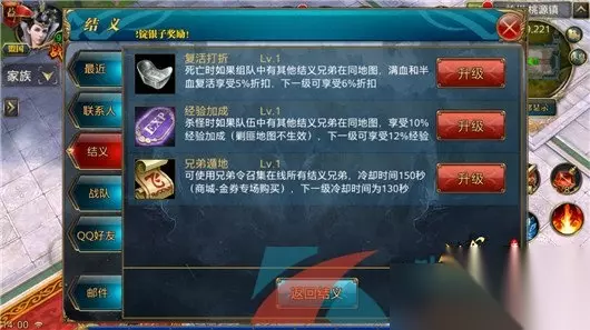 6、结义之后,即可在结义页面查看结义技能,复活打折,经验加成,兄弟遁地,升级后效果更佳;
