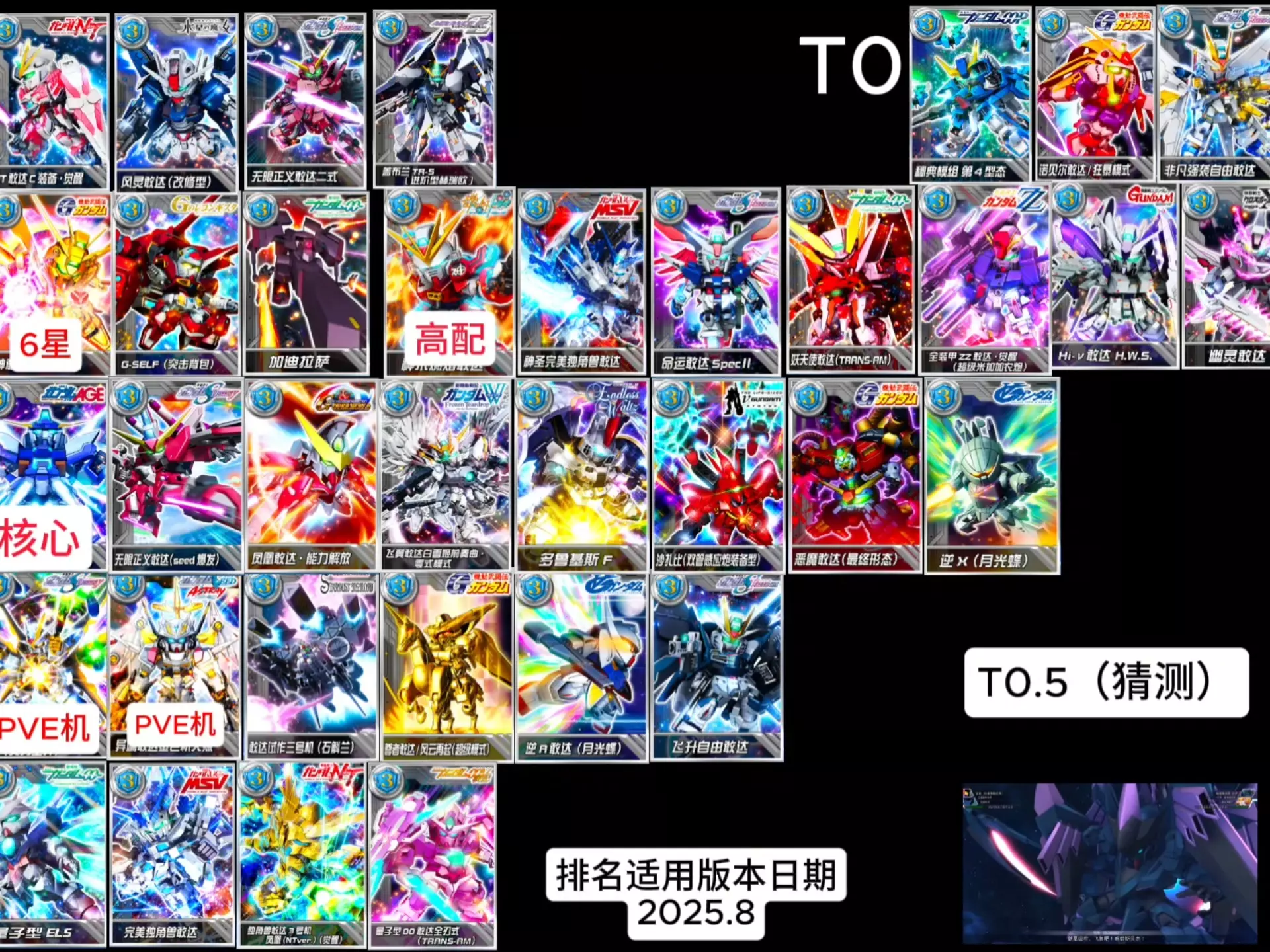 这是目前相对最理想的主角机体阵容搭配,2.0新典藏机体ELS为队长,搭配同样是近期新机体的G-SELF完美背包,再与其他老将们配合,胜率极大。 阵容四 00系列队1 狱天使敢达(最终决战仕样)、GN武装TYPE-D力天使、量子型00敢达全刃式、00敢达七剑、雪崩能天使敢达 队长技:00敢达七剑 战舰:托勒密2