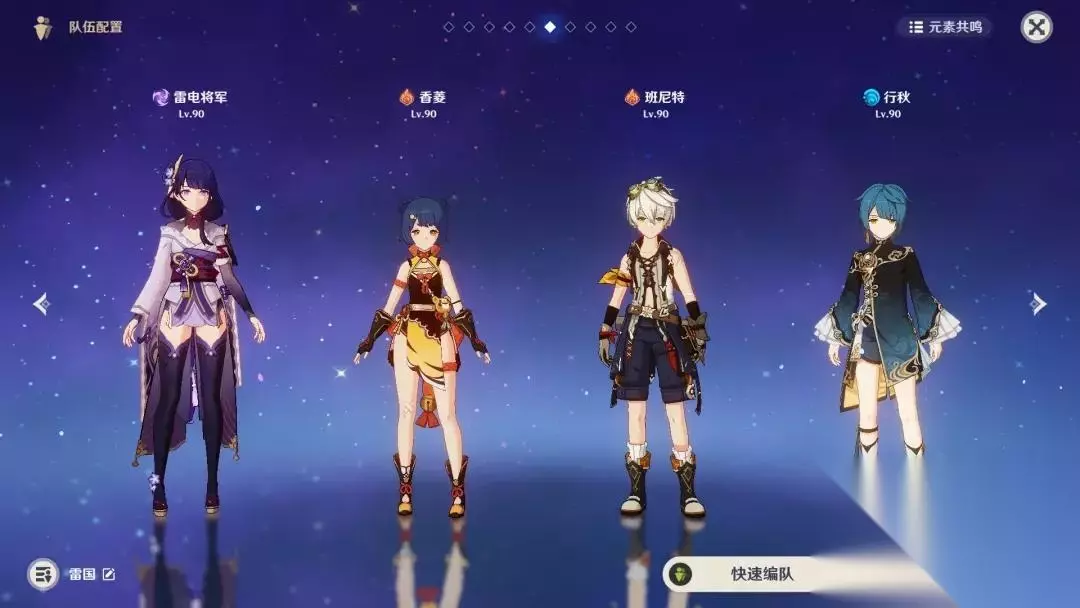 1阵容点评 平民满星深渊的高性价比阵容之一,金数少操作简单循环无脑是其最大的特点,在如今多boss和精英怪的深渊具有很强的攻坚能力。缺点是占用了3个4星t0角色,很考验旅行者另一路的阵容完整度。其次在面对小怪时的超载和雷神削韧会极大降低队伍的清杂效率,雷神出圈和香菱蒸发丢失都会极大损失dps。最后因没有非常强力的收尾手段,所以很考验旅行者对自己队伍练度的斩杀线把握程度。 2操作手法 雷神e→行秋q→班尼特qe→香菱qea→行秋e(祭礼eae)→雷神qae→班e 3配装 雷神:4绝缘 充攻暴 天赋推荐a1 e9 q10 武器首选薙刀,其次薄荷和鱼叉,都没有则西风枪。 香菱:4绝缘 攻/精/充火暴 天赋推荐a1 e9 q10 武器首选薙刀,其次赤沙和鱼叉,最后是薄荷保证充能200左右即可 行秋:4宗室 攻/充水暴 天赋推荐 a1 e9 q10 武器五星首选绿剑,其次雾切,4星只推荐祭礼。 班尼特:4教官 充能沙带5星,其余位置尽量堆高充能 天赋推荐 a1 e1 q10 武器首选风鹰或雾切,其次天空,4星推荐须弥锻造武器,充能220以上可选择暗巷闪光。 4配装细节 1.雷神充能非专武推荐至少280,最高300。1精专武充能270即可。 2.雷神为0命时,队伍输出同练度下香菱占一半以上,因而圣遗物和武器优先满足香菱,其次雷神。比如没有薙刀和薄荷时,鱼叉给香菱,西风给雷神。有薙刀时,优先给香菱。 3.当boss体型够大(比如古岩龙蜥),香菱多次打出双判会出现很多的蒸发丢失问题,此时精通沙并不如攻击沙。嫌麻烦的话哪个沙漏词条好带哪个就行。 4.行秋绿剑雾切的情况下,非6命充能需求在210左右,6命充能185左右。祭礼行秋时,满精祭礼或6命有其一则不需要考虑充能放心堆攻双爆,这里更推荐绿剑雾切是因为实战祭礼eae会拖班尼特的buff时间。 雷九万班