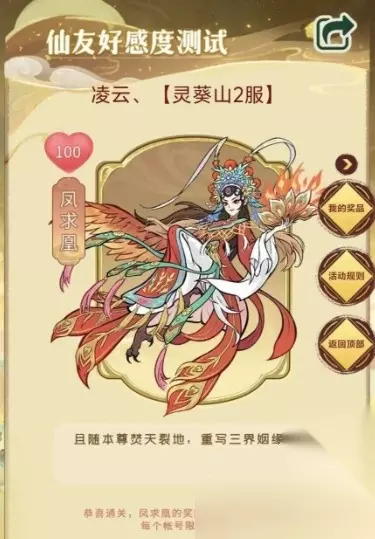 3.问题三 【单选】暴雨突至淋湿凤求凰的羽毛,你当如何? 【答案】:C.引天光蒸云霞:“且看虹桥接羽霓” 4.问题四 【单选】凤求凰涅槃日将至,如何备礼方显赤诚? 【答案】:B.离火珠 5.问题五 【单选】七夕兰夜你们悠游湖畔,当孩童扯住她的衣袖讨要糖果,凤求凰会? 【答案】:C.变出会唱歌的糖凤凰。