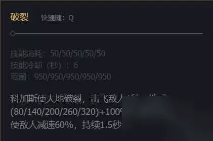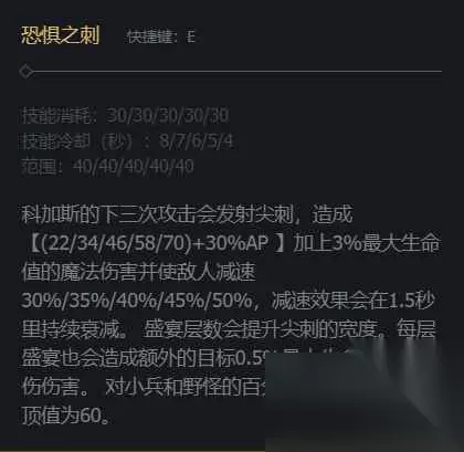 5JA 技能介绍5JA 1、科加斯技能主E副Q,E技能是让科加斯下面的三次攻击发射尖刺,带有额外的伤害加成和减速效果。5JA