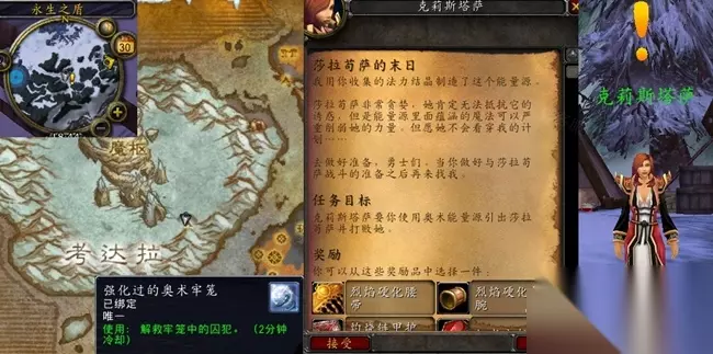《魔兽世界》怀旧服wlk莎拉苟萨的末日任务攻略 接取等级:69 接取NPC:克莉斯塔萨(北风苔原,考达拉,使用【强化过的奥术牢笼】召唤) 完成NPC:克莉斯塔萨(北风苔原,考达拉,使用【强化过的奥术牢笼】召唤) 奖励声望:250点龙眠联军 任务开始:
