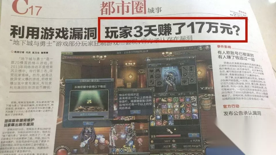 DNF的计划通过检索游戏中的数据发现了这个玩家,并处理了这个玩家的头衔。最悲哀的是,这家伙分享之后,游戏里的金币价格开始泛滥,但是官方修复三天后才处理,这是最要命的,而且他们的处理方法简单粗暴,就是直接删除云幂的NPC