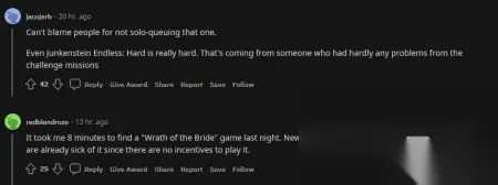 不过,《守望先锋:归来》社区中其他玩家的回应表明,这似乎是一个比较普遍的问题。除了该 Reddit 用户以外,其他玩家也表示他们遇到了类似的问题。一些玩家甚至声称游玩的方法就是和另外 3 个朋友一起开黑,而不是随机匹配。此外,也有玩家表示即便是新的“新娘之怒”限时模式也耗费了他 8 分钟时间等待匹配,这表明匹配时间长不于“怪鼠复仇”。