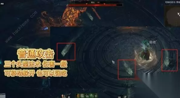 1、首先是可以知道这个boss的普通攻击是释放3个骷髅头形式,伤害一般也可以一位躲掉。