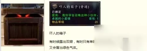 【相关推荐:说服者任务攻略】 魔兽世界吓人的箱子怎么获得 1、该道具等级是20,使用时可以召唤小伙伴是通过失踪的传家宝任务获得的。 2、先来到暴风城的旅店找到埃德加对话领取任务,接着来到码头上船跟兽人领取任务。 3、再来到暴风城找到拍卖师,领取任务接着到暗巷领取任务,再找到炼金师跟材料商。