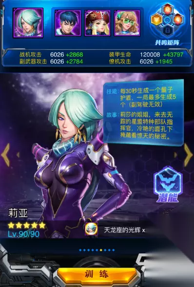 四、潜能系统 驾驶员在达到90级后就会解锁潜能系统,潜能又会被分为技能和数值两个部分,每页序列共有7个节点,我们在解锁节点的时候需要花费驾驶员本体光辉,每次解锁升级能提升他们的战斗力,升到满级才能解锁下一个节点,依次解锁升到满级后,就会获得一个共鸣核心也就是技能,大家可以将其装载到角色的共鸣矩阵中,让战斗表现更进一步。