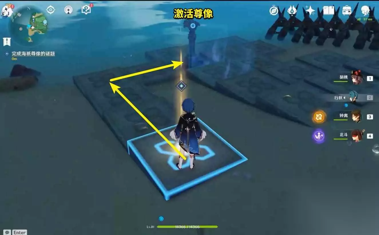 2、踏上光柱石板,走到没路的地方,即尊像面前,之后启动尊像,远处的一块石板就会到我们左手边,再按照下图所示顺序走到尊像的另一侧,到了尊像另一侧后,再次启动尊像,之前移动过来的石板就会再移动回去,接着按照下图所示顺序走至发蓝光的终点即可。