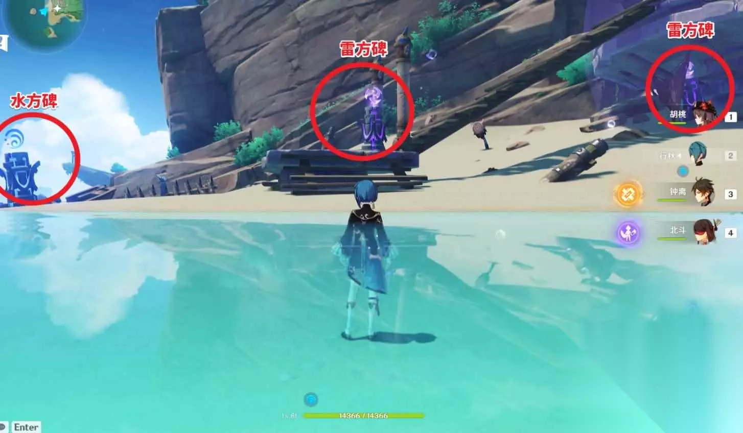 二、任务流程 1.将三份绯樱绣球交给久美 2.前往西侧的丘丘人营地 3.营救阿妮萨 4.与阿妮萨对话 5.完成海祇尊像的谜题 6.与阿妮萨对话 7.与久美对话 三、完成技巧 1、点亮丘丘人营地的三座雷元素方碑。两个雷元素方碑,一个水元素方碑,位置如下图所示,使用对应元素攻击解锁即可。