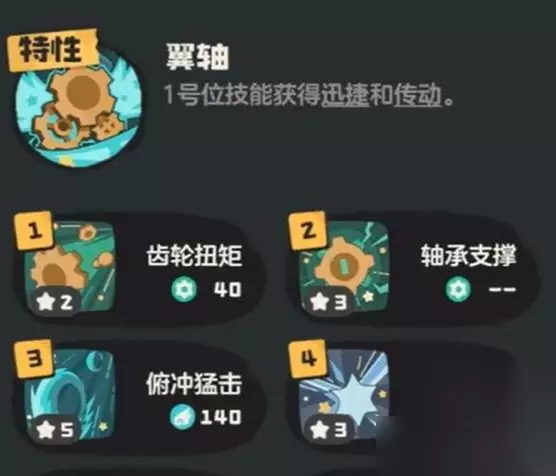 如图中所示,小编所推荐的技能就是这4个。其中齿轮扭矩这个技能能够有效搭配被动,强化角色的输出。而轴承支撑也是同理,能够更有效地减少角色的消耗。在此基础之上,俯冲猛击这个技能是高威力的输出技能,倾泻这个技能在有一定输出的同时还能够消除双方的印记效果,功能性非常强大。