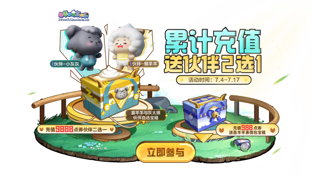 累计充值9888点券可领喜羊羊与灰太狼伙伴自选宝箱。