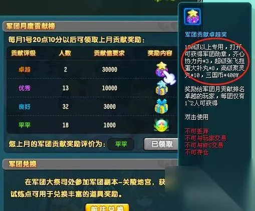 每月1号会结算上月的军团贡献排行,达到卓越贡献的团员可以领取(卓越礼包),有齐心三个