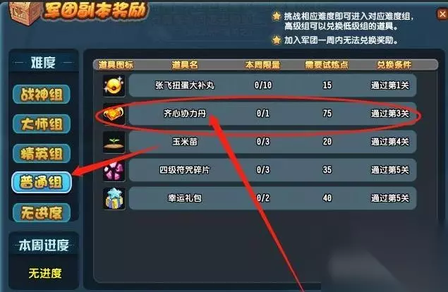 军团副本试炼点兑换,每周可花费75点试炼点,在军团副本兑换商店兑换一次。(注意,必须通过普通难度第三关才能兑换)