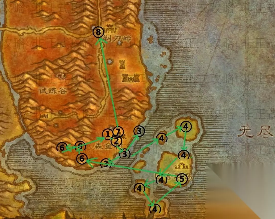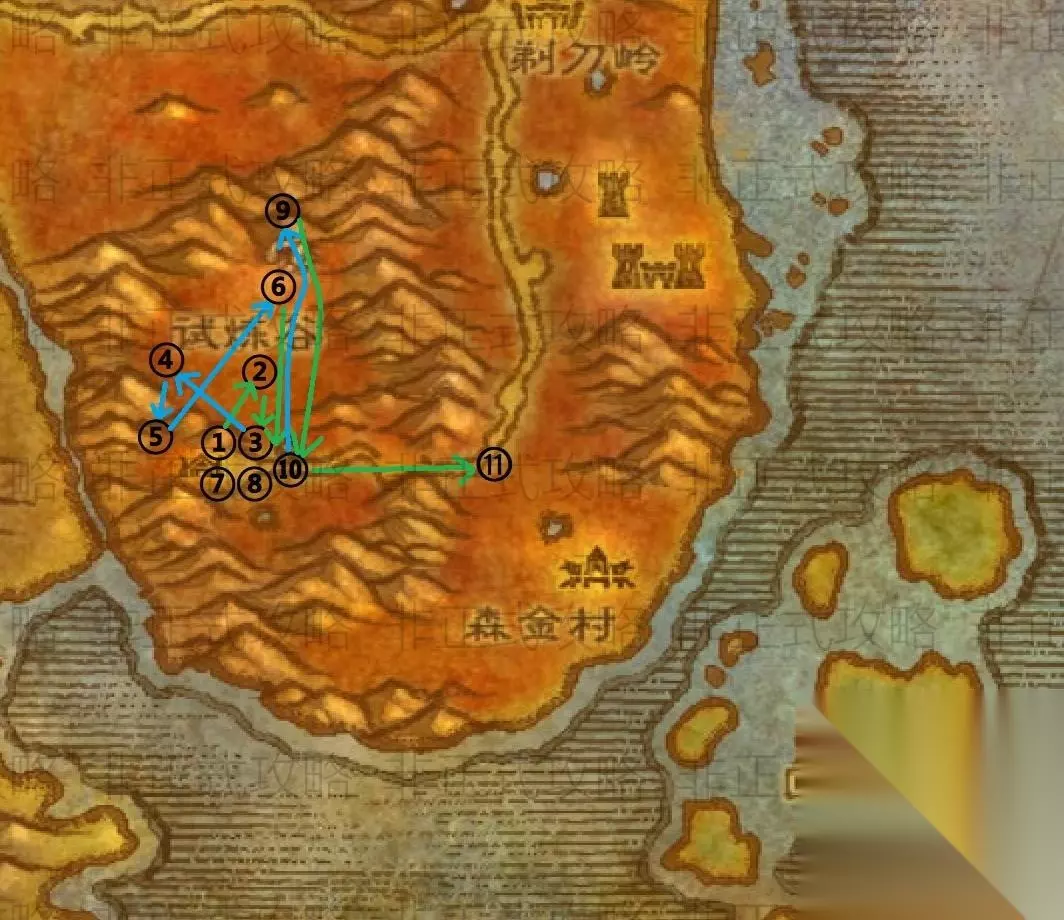 (森金村)地图上的序号对应任务顺序 1.在森金村外找到“裂齿拉尔”,接受任务“科尔半人马的进攻” 2、村子里找到“加德林大师”交任务,接受“明斯纳的头骨”、“向奥戈尼报告”、“扎拉赞恩”,接受任务“奥沃尔大师”,在草丛中找到“维林长牙”摆脱并接受任务“Zalazane”, 3.击杀海岸上的“小海蟹”可获得8个“蟹胶”,击杀浅水中的“龙虾人”可获得4个“龙虾人眼球”。 4.击杀“杜洛塔虎”,获得4张“杜洛塔虎皮”。 5、在“回音群岛”村庄,击杀“恶魔巨魔”和“巫毒巨魔”各8个,击杀“扎拉赞恩”获得“扎拉赞恩的头颅”。拾取魔法阵中的巨魔头骨即可获得“敏什纳的头骨”。 6.来到森金村西南的“科卡尔悬崖”,燃烧“攻击计划:试炼谷”、“攻击计划:森金村”、“攻击计划:奥格瑞玛”。 7、回到森金村,交任务:“明斯纳的头骨”、“扎拉赞恩”、“扎拉赞恩”、“奥沃尔大师”,在村外找到“裂牙拉尔”,交任务“科尔半人马的进攻”。 8.向北前往“剃刀岭”,找到“奥格尼尔.灵魂裂缝”,交任务“向奥格尼尔报告”。完成后,请记住将《炉石传说》设置为“剃刀山”。 至此,森金村的使命就结束了。请期待下一章:剃刀岭。 不知道这样写练级任务攻略效果如何?欢迎留言讨论。
