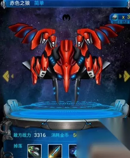 雷霆战机boss模式掉落 选择关卡 BOSS模式一共有4关,没关都可以获得不同的武器,系统每天会赠送4次机会,用完的话小伙伴们就要花RMB购买了,一天最多可以购买4次,也就是说一天可以玩八次; 在每个关卡中,针对玩家分为2种难度,简单和普通;简单难度每天限玩8次,每次消耗500金币;普通难度每天限玩5次,每次消耗1000金币。当然难度不同掉落也不同,比如简单模式下打不出来战斗力最高的装备,而普通模式则可以打出“异形”。 雷霆战机BOSS模式中有4个关卡,名称分别是天龙座空间站,白鸟空间站,天马空间站,仙女座空间站