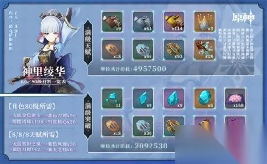 2、神里绫华天赋突破材料 1级升2级: 「风雅」的教导*3、破旧的刀镡*6 2级升3级: 「风雅」的指引*2、影打刀镡*3 3级升4级: 「风雅」的指引*4、影打刀镡*4 4级升5级: 「风雅」的指引*6、影打刀镡*6 5级升6级: 「风雅」的指引*9、影打刀镡*9 6级升7级: 「风雅」的哲学*4、名刀镡*4、血玉之枝*1 7级升8级: 「风雅」的哲学*6、名刀镡*6、血玉之枝*1 8级升9级: 「风雅」的哲学*12、名刀镡*9、血玉之枝*2 9级升10级: 「风雅」的哲学*16、名刀镡*12、血玉之枝*2、智识之冕*1 3、绯樱绣球 一号位置: