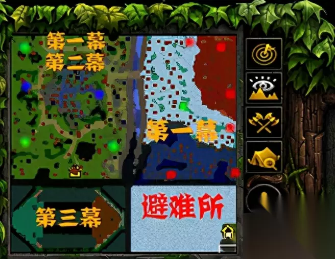 绿点为方尖塔所在地(出生地,可学习技能) 蓝点为两个特殊怪位置(左侧为一棵树,右侧为赤龙) 红点处为各个掉套装配件的boss(骨龙蓝龙凤凰等随机刷) 左侧绿地是第一幕前期以及第二幕主要活动范围,右侧雪地是第一幕中后期主要活动范围。 第三幕则会到达地图下方进行。 一:游戏主要流程介绍 《伏魔战记》将其分为三幕进行游戏,每一幕所需完成的胜利目标不同,完全全部三幕内容后游戏宣告胜利。 第一幕:探索神秘森林,在这片森林中我们需要提升自身装备,学习技能并且抓捕到合适的坐骑等等来尽可能完成发育。 第二幕:护送大将军和大法师,玩家扮演保镖角色护送NPC到指定地点,NPC被杀,任务失败。 第三幕:同Dota类游戏规则一样,玩家需要前去摧毁敌方老家获胜。 二:游戏特色介绍 坐骑系统:在2008年的时候伏魔战记便有了这样的特色,算是引领了一代风潮! 坐骑系统功能强大,完善,在伏魔战记里所有看到的中立怪物(一棵树除外)基本都可以成为通过【诱捕】技能成为坐骑。
