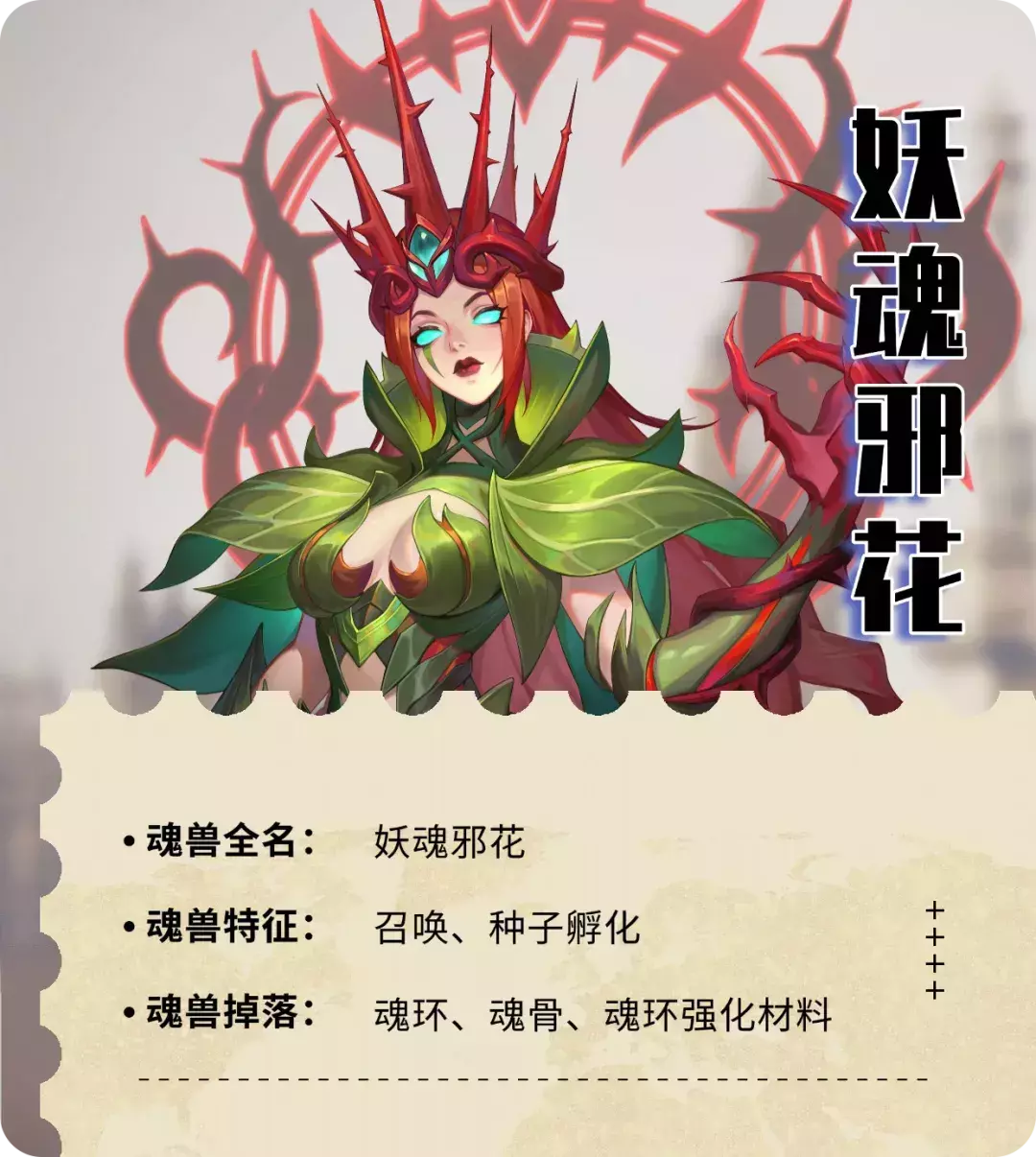 在战斗之时,它还会洒下荆棘之种,时间到了妖魂邪花的种子会孵化出小型植物系魂兽发起围攻,在这种情况下,需要及时踩踏,阻止其种子孵化。