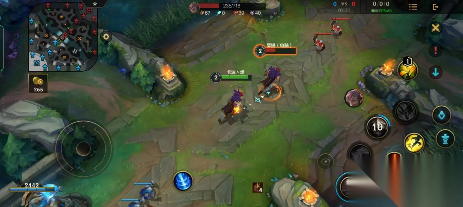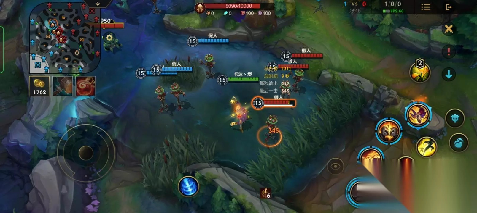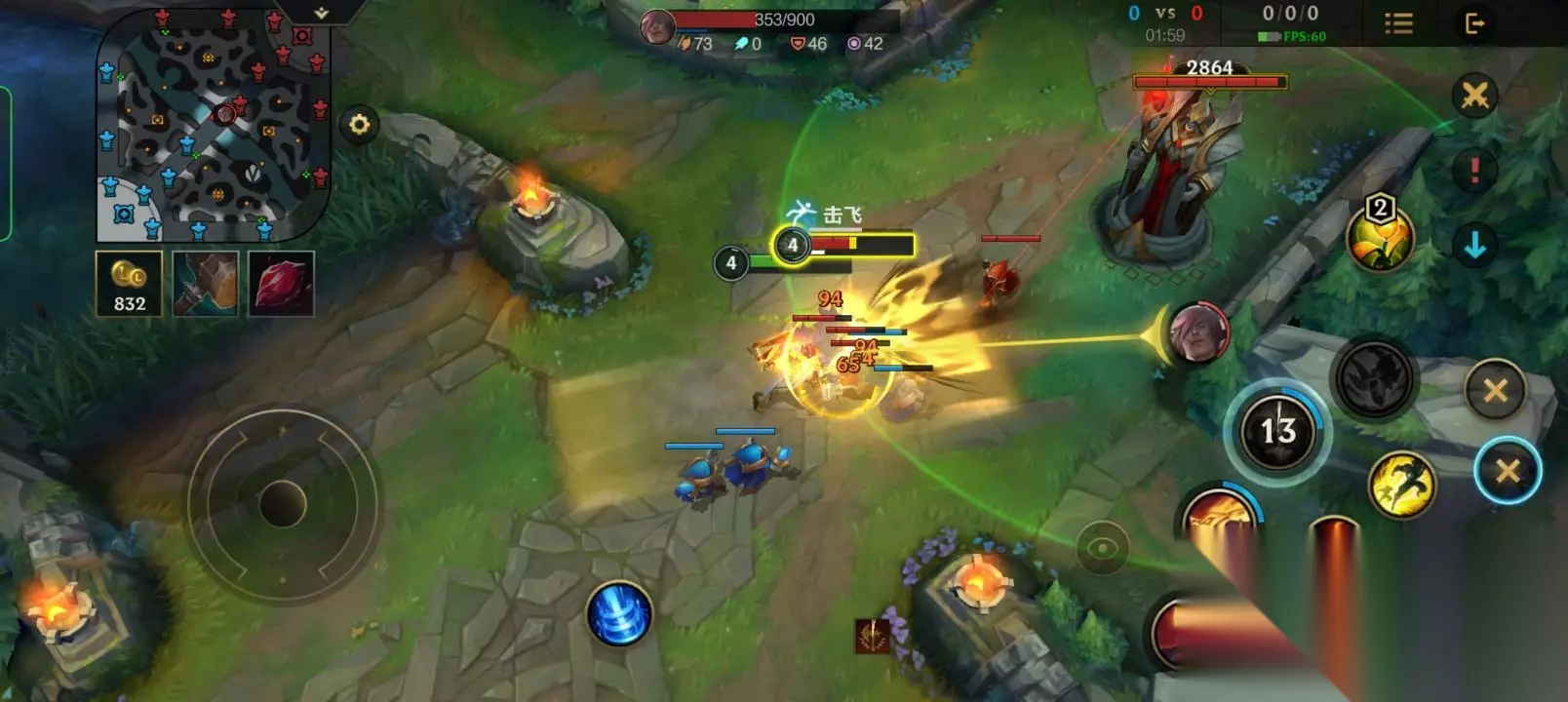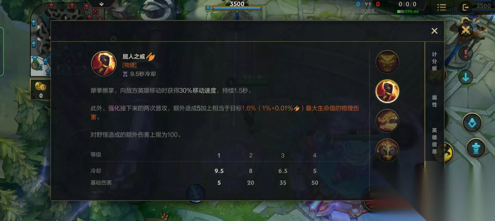 三,腕豪的玩法 ①在1级时,腕豪就具有很强的单杀能力,如果在1级时敌方比较激进,那么我们可以上去和他硬刚,这样有很大的概率拿一血。没有机会的话就抢线权升2抓机会击杀敌方。