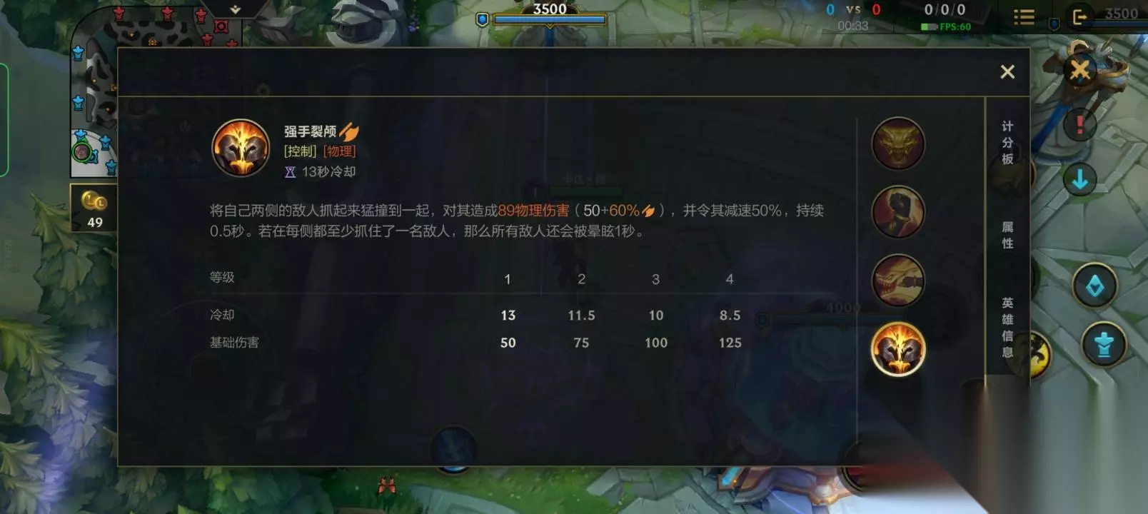 ③腕豪的3技能是强手裂颅:瑟提将他两侧的所有敌人猛撞到—起,对他们造成伤害和晕眩效果。如果敌人仅位于他的一侧,那么他们只会被减速而不会被晕眩。